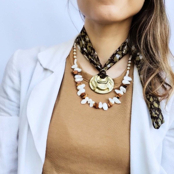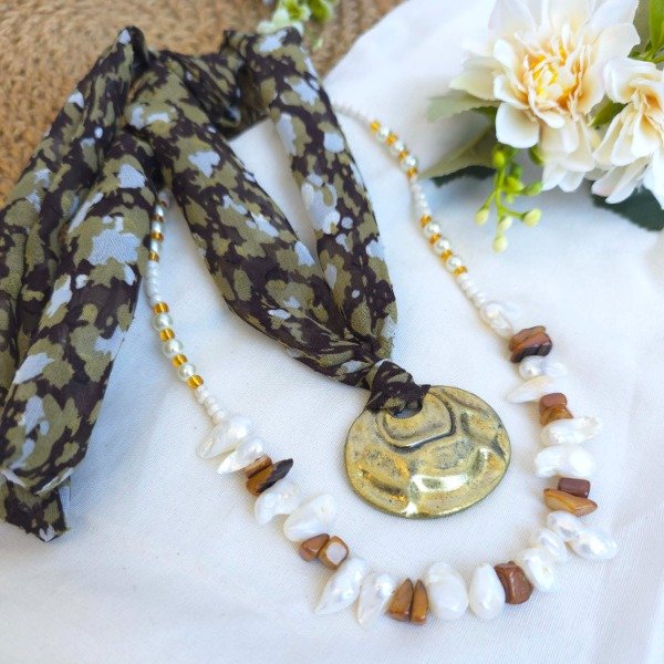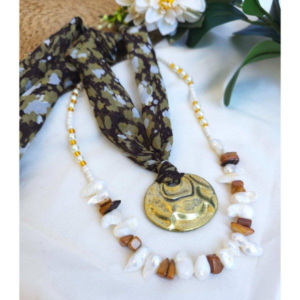 El set incluye un collar de tela, con medallón bronce de 85cm aprox,